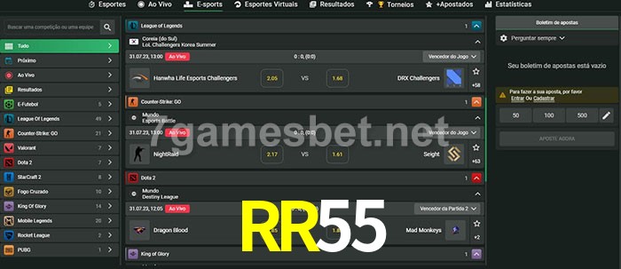 O RR55 oferece uma grande seleção de opções de apostas em e-sports com probabilidades competitivas
